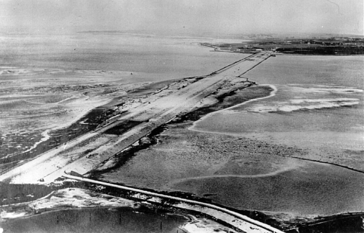 Op de foto zie je de Amsteldiepdijk vanaf Ewijcksluis. Het was de eerste stap in de afsluiting van de Zuiderzee. Wieringen is op de achtergrond zichtbaar. Door verzakking van veenlagen in de ondergrond ontstond een moerasnatuurgebiedje aan de binnenzijde van de dijk. Dat heet 'De Verzakking'. Bij de Zuiderzeewerken is ook de N99 aangelegd. Ondanks de asfaltering heet die op Wieringen nog steeds de Betonweg. Deze weg splitst het voormalige eiland in tweeën. Het is een onophoudelijke bron van lawaai en regelmatig zijn er verkeersslachtoffers.