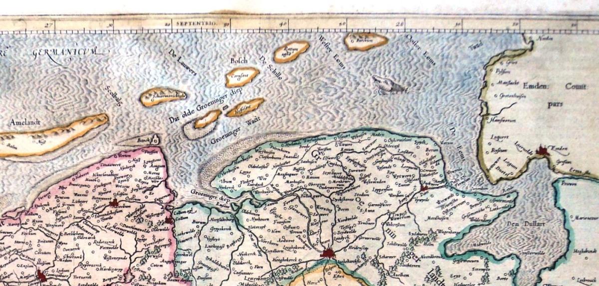 De kopergravure (onder) is gemaakt rond 1568 en opgenomen in het Speculum Orbis Terrarum dat in 1578 is gedrukt. Dit Speculum is een wereldatlas waar deze kaart een onderdeel was. De titel van de gravure is Frisiae Antiquissimae.