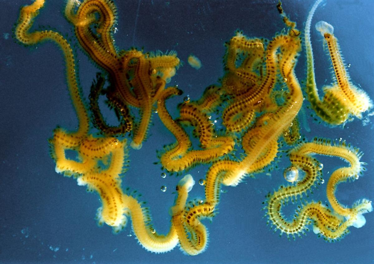 De gestippelde dieseltreinworm ziet er echt als een dieseltrein uit. Het dier beweegt zich eigenaardig schoksgewijs voort. Hij heeft een soort lange slurf waarmee hij zijn prooi leegzuigt. In het voorjaar zie je overal op het wad flesgroene, ongeveer 1 centimeter grote geleiklonten met eieren van deze worm.