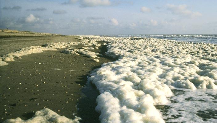Op het strand liggen regelmatig grote vlokken gelig schuim. Vooral bij harde wind in het voorjaar ontstaan hele banken van dit schuim. Het zijn resten van afgestorven algen. Het schuim ontstaat omdat de gelatinelaag waarin de bruine slijmalg of schuimalg Phaeocystis globosa leeft, door de golven wordt opgeklopt. Het is geen vervuiling. Bacteriën breken het schuim weer af.