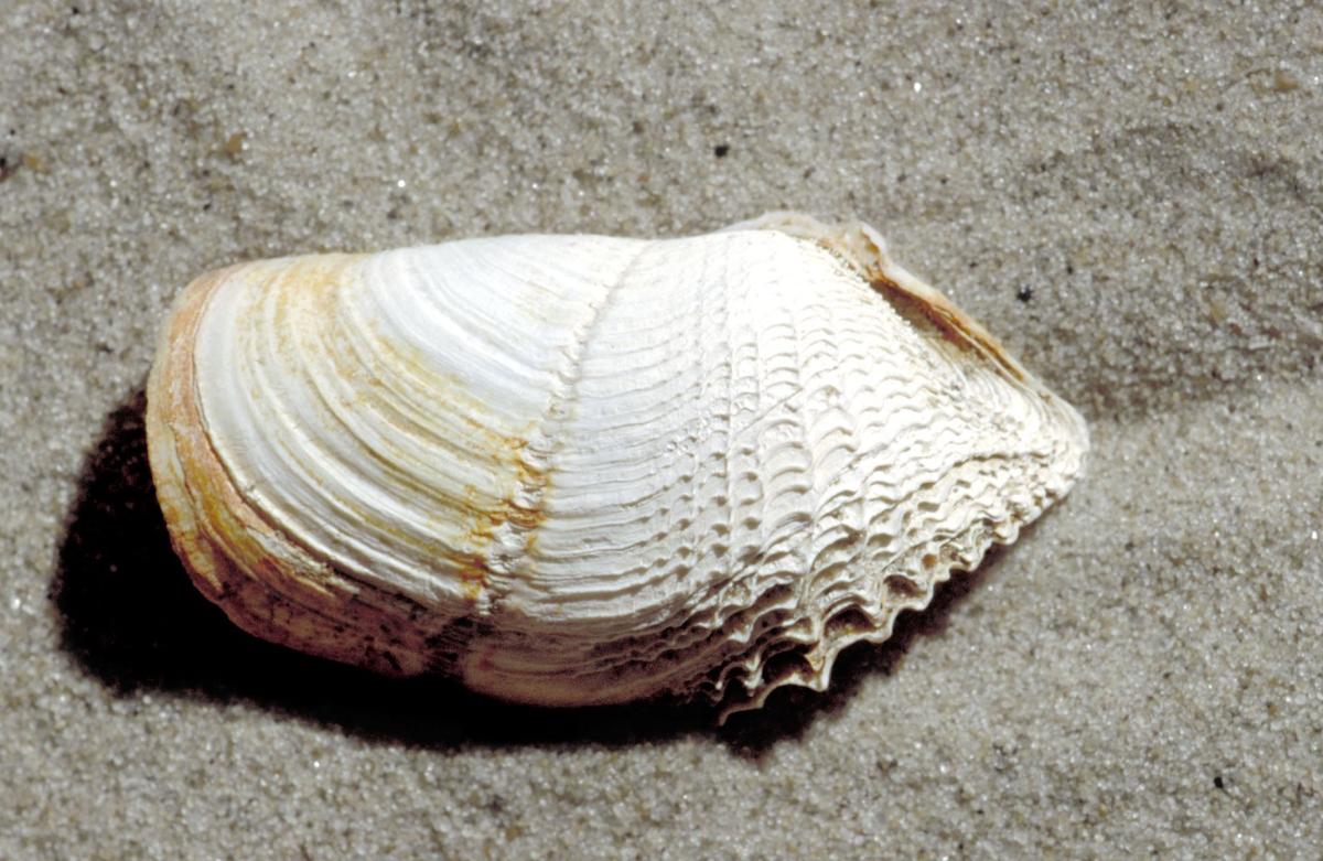 Oude, fossiele kleppen van ruwe boormossel zijn algemeen aan onze stranden, en zijn vaak donkerder van kleur (blauw of bruin).