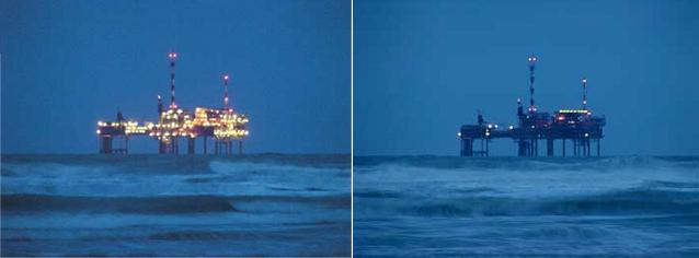 In 2004 werd een studie afgesloten naar de effecten van de verlichting van boorplatforms op trekvogels. Studente Hanneke Poot van de Universiteit van Amsterdam vond uit dat wit licht, zoals dat op de platforms gebruikt wordt, tot 80% van de vogels beïnvloedde. Het beste resultaat had blauw en groen licht, waar maar 5% van de vogels op reageerde. De NAM heeft het nieuwe inzicht bekend gemaakt onder collega-organisaties en wilde eigen platforms aanpassen. De proef heeft ertoe geleid dat in 2007 op de pier van Ameland lantarenpalen geplaatst worden die groen licht verspreiden. Ook werd een boorplatform boven Terschelling van groene verlichting voorzien. De resultaten waren bemoedigend, maar helaas is het daarbij gebleven. De helicopterpiloten raakten in de war door het groene licht en konden daardoor naar eigen zeggen niet veilig landen op het groene platform.